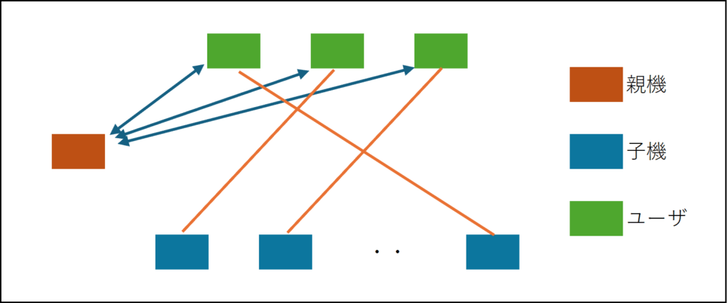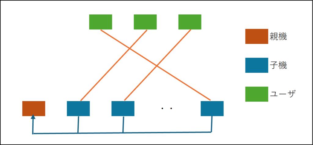 もう一つの方法は、クライアントはUser IDやIPアドレスに応じて、ランダムに子機にソケット接続を行い、参加通知を行う方法である(接続先の子機の割り当てはロードバランサーを用いてもよい)。参加通知を受け取った子機はサーバ間通信(バックプレーン)を使って親機に参加者の情報を転送することで情報を親機に集約する。